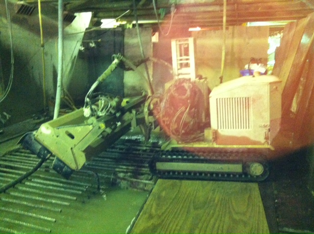 We placed our Hydrodemolition power pack on the surface and ran High Pressure hoses underground, routing them down the ventilation shaft. We then drove our robotic Hydrodemolition machine into the tunnel and started blasting.